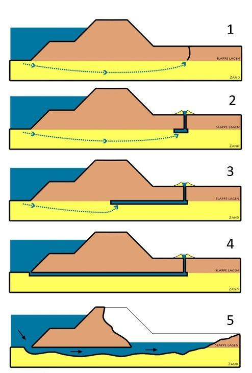 When piping occurs, a channel (pipe) is created under the dike by backward erosion. The water, containing sand particles, rises on the inside of the dike. Piping can lead to weakening and eventually failure of the dike (see Figure 1). The place where water and potentially sand particles flow out landside of the dike is called a sand boil.