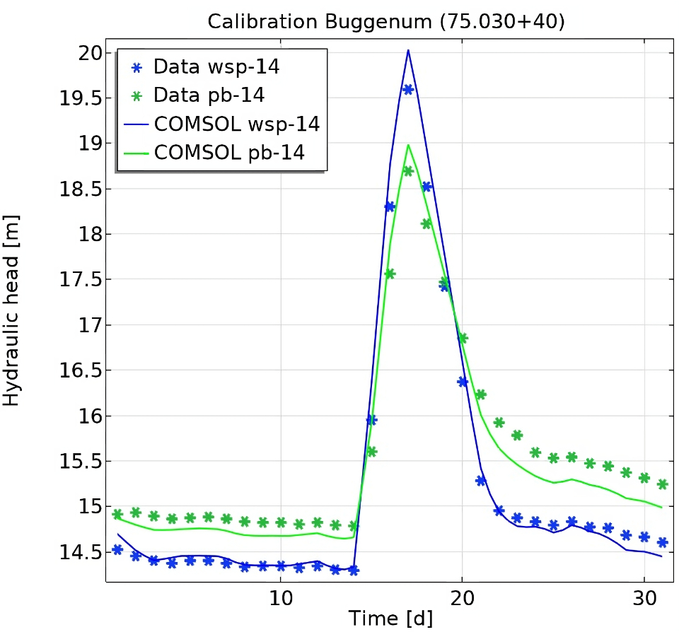 Figure 2. Calibration of the COMSOL groundwater model for the Buggenum site using water pressure (wsp-14) and monitoring well data (pb-14).