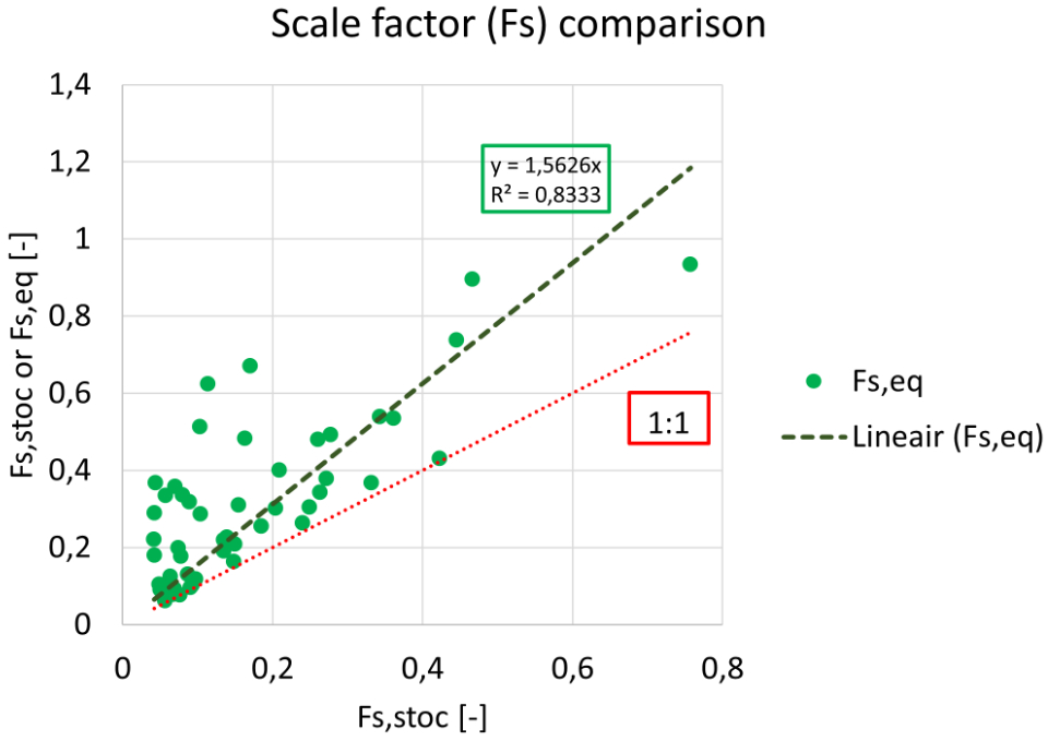 Figure 3. Linear regression between Sellmeijer scale factor (Fs) of the stochastic analysis (FS,stoc) and associated with the critical gradient (FS,eq), leading to the derivation of factor 1.56