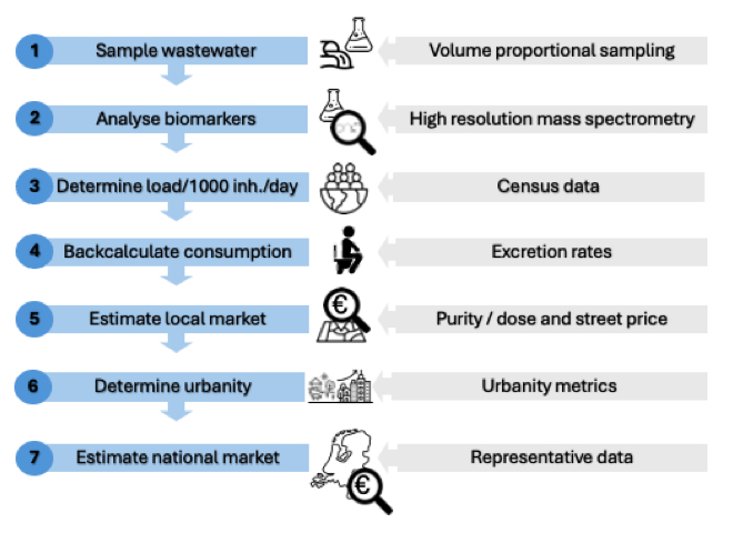 Figure 1. Seven steps to get from drug residues in wastewater to a picture of the national illicit drugs market [3]