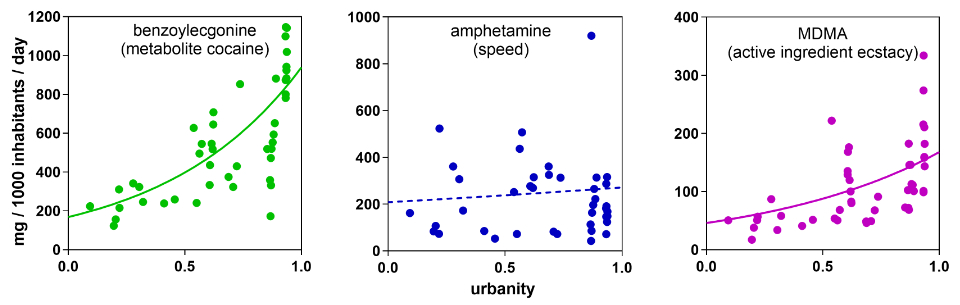 Figure 2. Volumes of cocaine (left), amphetamine (centre) and MDMA (right) residues per 1,000 residents per day in relation to the urbanity of the wastewater treatment plant's treatment area. The dots are weekly averages, the lines the fit model. Solid lines show significant trends.