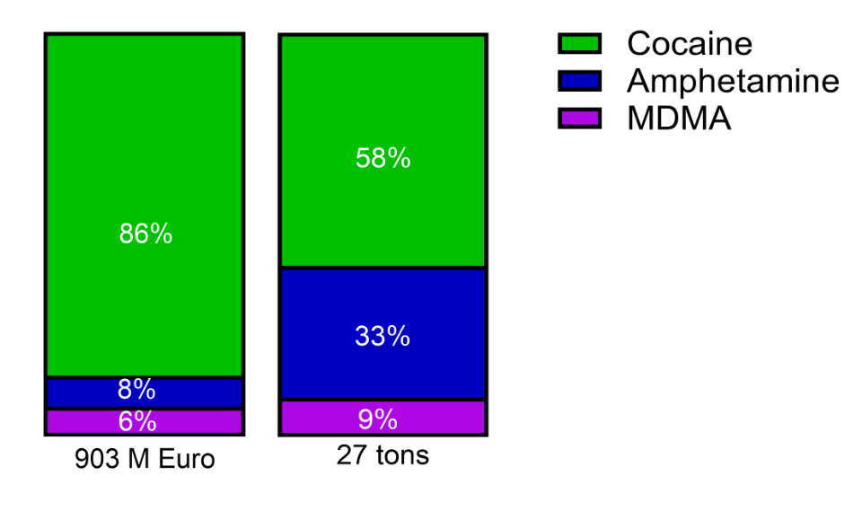 If we compare the presumed market size of the Netherlands with international estimates based on customs, police and prevalence data, the estimated Dutch market accounts for 7.3% (cocaine), 6.3% (amphetamine, not including methamphetamine) and 11.6% of the total EU financial market size pre-Brexit. This would appear realistic, as the Netherlands generates 3.4% of the EU population (January 2020) and 6.0% of the gross European product, and the studied illicit drugs are also known to be relatively widely used in the Netherlands compared to other European member states [5].