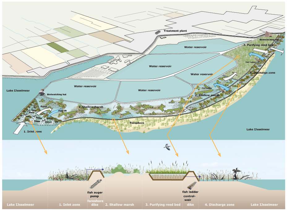 The design process revealed two key criteria. Firstly, the landscape should be a suitable habitat for fish and birds year-round. Secondly, the purification of the landscape should focus on nutrients, suspended solids and dissolved organic compounds. Thus, the landscape should be heterogeneous and accessible for fish and macroinvertebrates, and provide a place for passive and active filtration and conversion of suspended and dissolved compounds. The functional design outlines an area of roughly 150 hectares, which can be created using the sediment obtained from the proposed adjacent storage reservoirs. It consists of four zones: the inlet zone, the marsh zone, the purifying reed bed and the outflow zone (Figure 1). Three ecotopes are represented in the marsh zone: ‘Floodplain grassland’, ‘Reed marshes’, and ‘Aquatic plants’ [1].