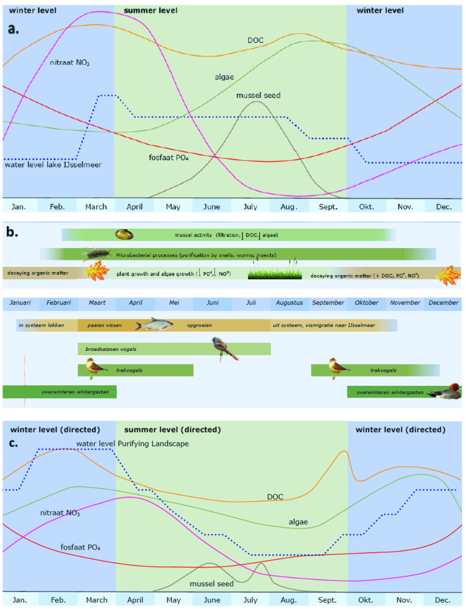 Figure 2. Seasonal dynamics of the purifying landscape. With a schematic example of (a) pollutant concentrations in Lake IJssel water including inflow and outflow zone, (b) the purifying and ecological functions, and (c) the expected concentrations of pollutants in water outflowing to storage reservoirs or the outflow zone.