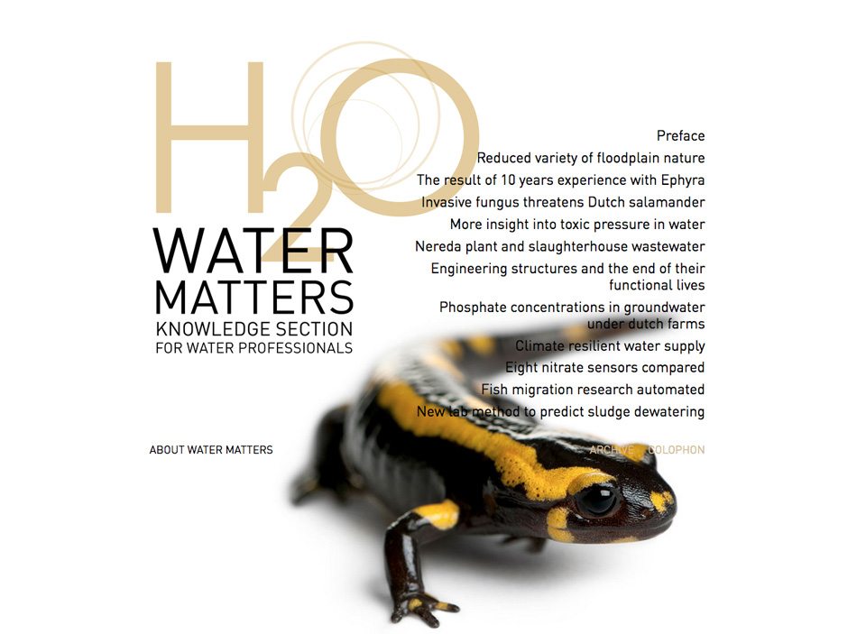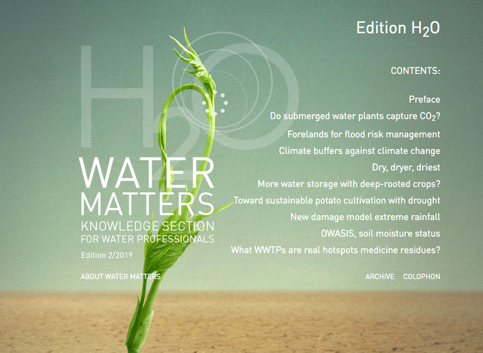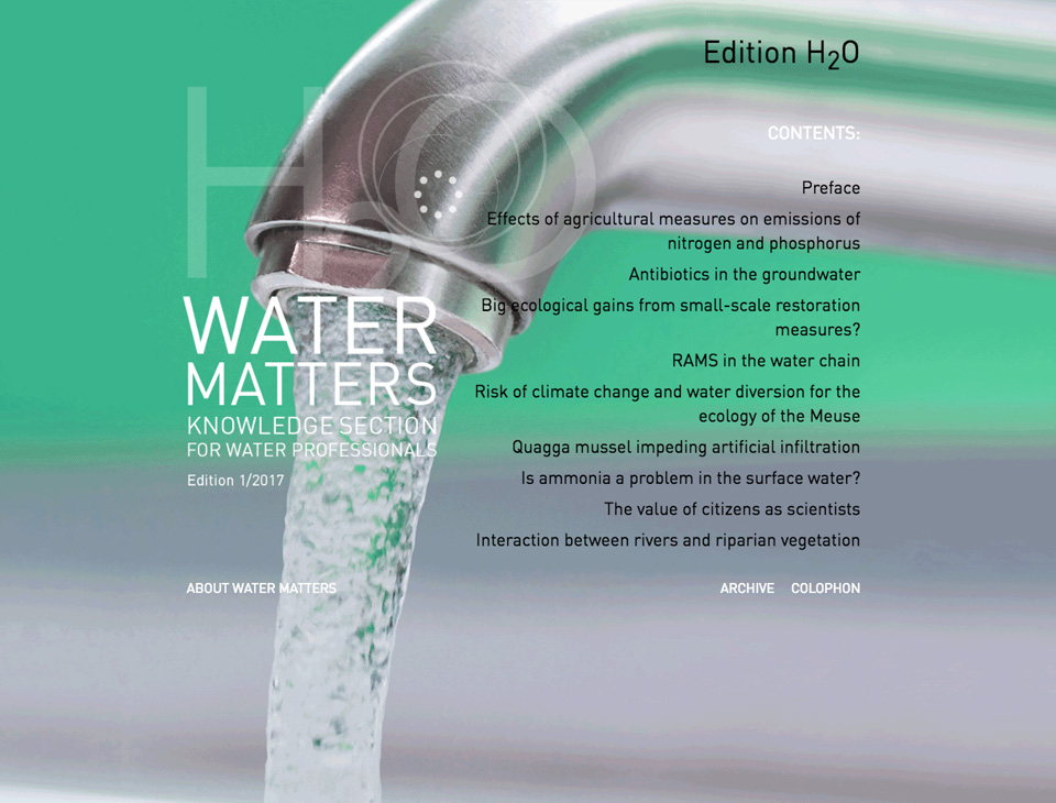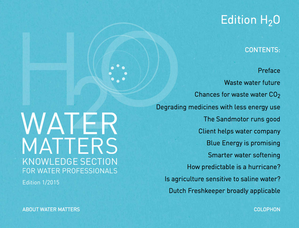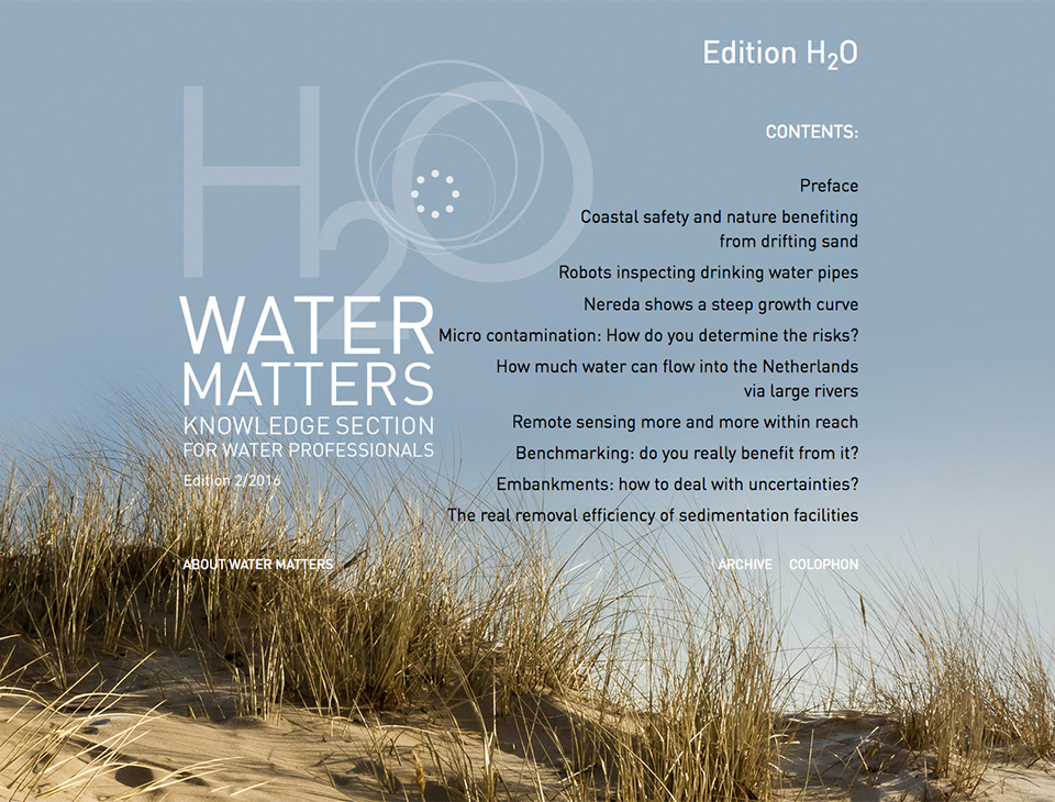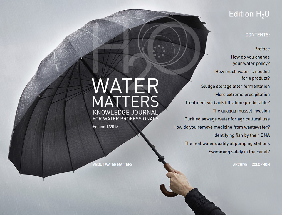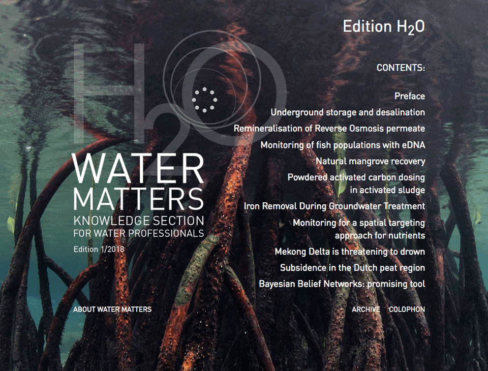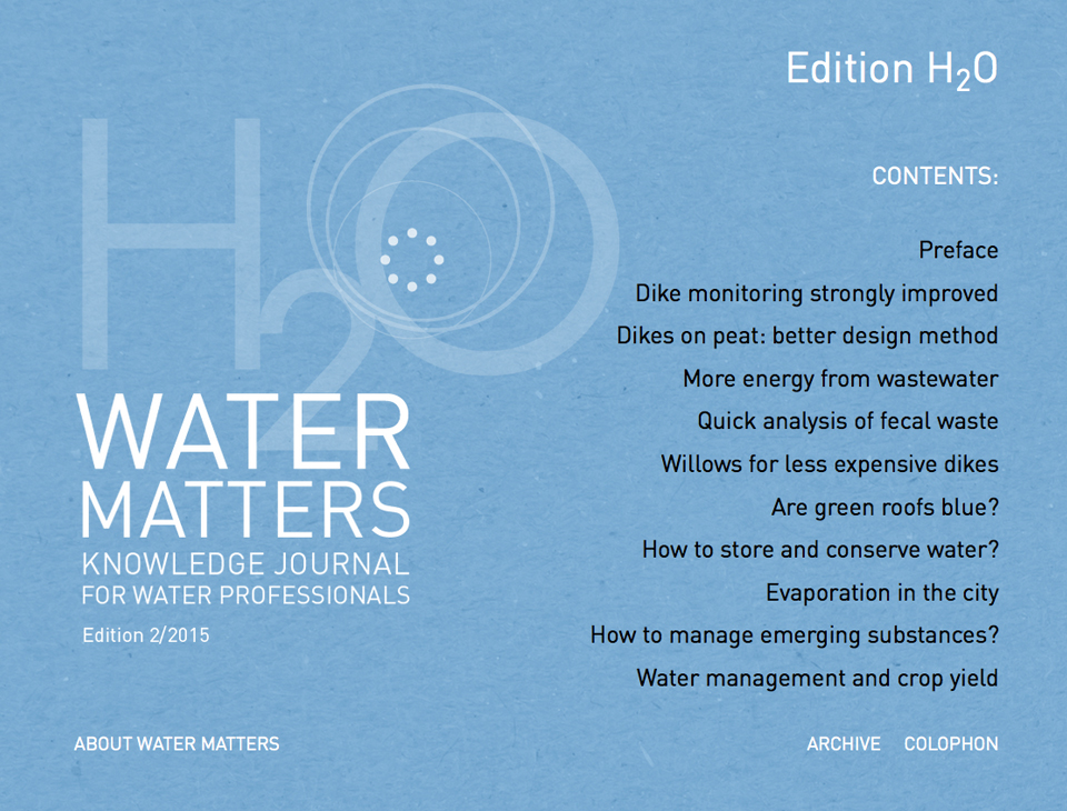 Water Matters, like the trade magazine H2O, is an initiative of Royal Dutch Water Network (KNW), the independent knowledge network for and by Dutch water professionals. KNW members receive Water Matters twice a year free of charge as a supplement to their journal H2O. The publication of Water Matters is made possible by leading players in the Dutch water sector. These Founding Partners are Deltares, KWR Water Research Institute, Royal HaskoningDHV and Stichting Toegepast Onderzoek Waterbeheer (STOWA). With the publication of Water Matters, the participating institutions aim to make new, applicable water knowledge accessible.
