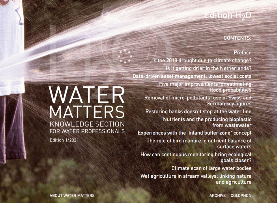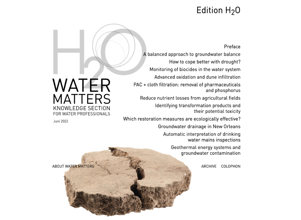 You are reading the nineteenth edition of Water Matters, the knowledge magazine of trade journal H2O. You will find four studies on a variety of topics, written by water professionals based on solid research. The editorial board, consisting of experts from the sector, made a selection based on a clear relationship with daily practice in the water sector, which is the purpose of Water Matters. Research, results and findings form the basis for articles that describe new knowledge, insights and technologies with a view to practical application.